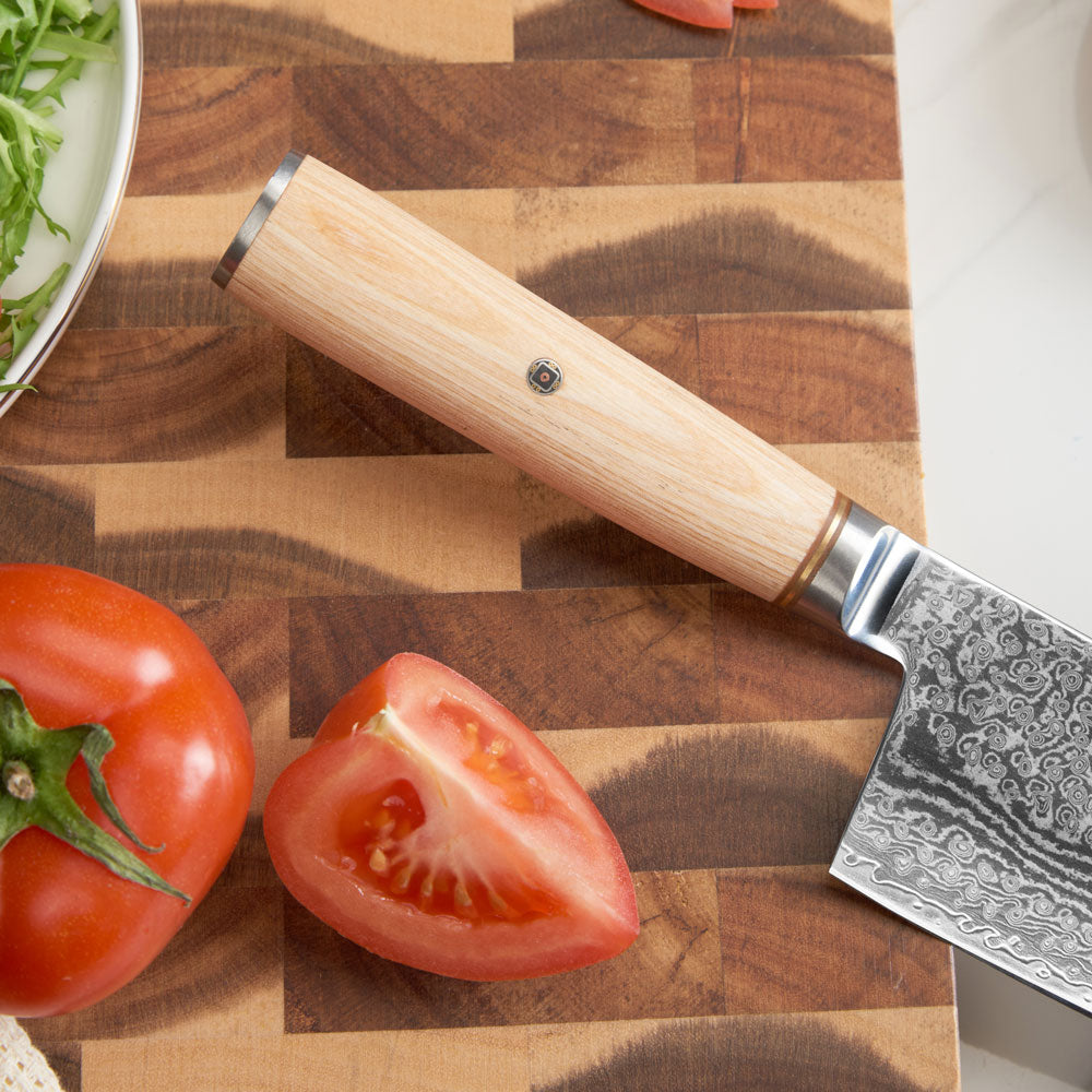 Cu o duritate de 62 HRC și o grosime de doar 2 mm, lama oferă precizie incredibilă în feliere, tocare și tranșare. Finisajul ondulat tipic Damasc nu doar adaugă un aspect sofisticat, ci și reduce frecarea în timpul tăierii.