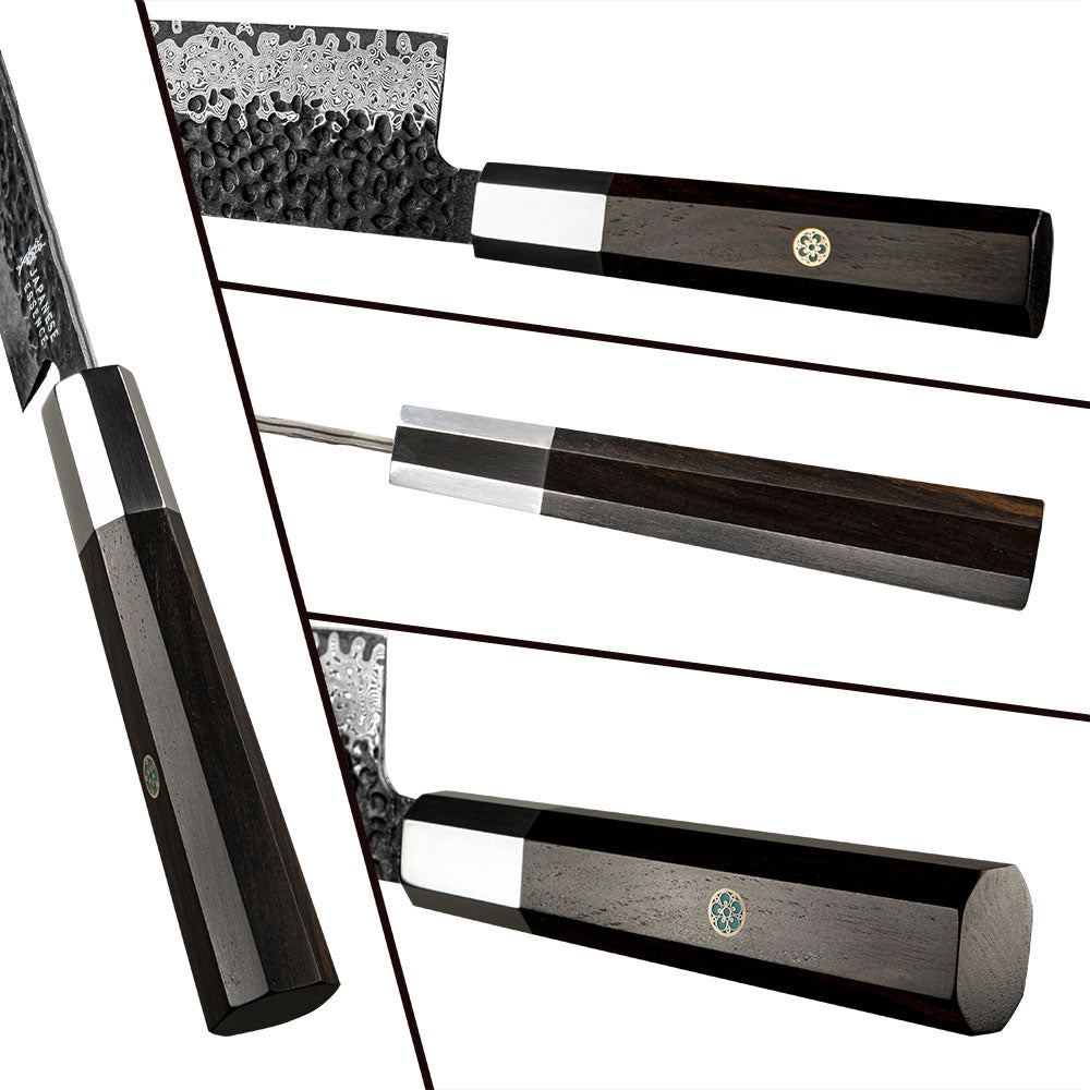- Versatilitate maximă pentru tăiere și tocătură.Lama Damasc 67 straturi, nucleu 10Cr15CoMoV – Tăiș puternic, durabil și rezistent la uzură