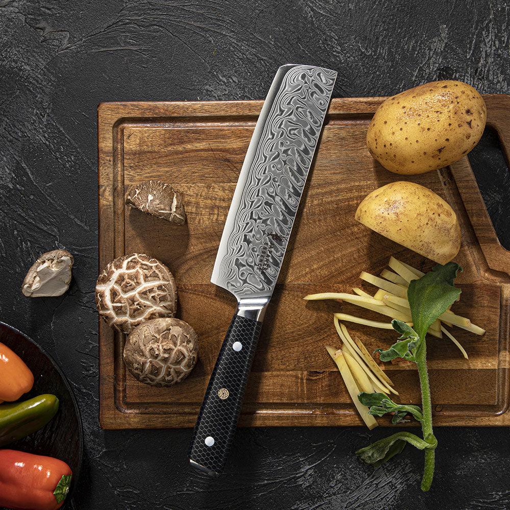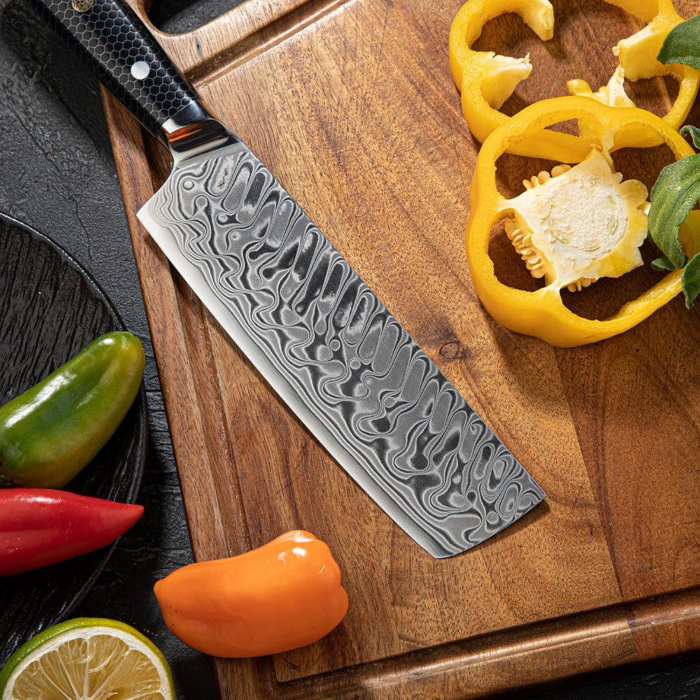 - Perfect pentru tăierea rapidă a legumelorLama Damasc 45 straturi – Rezistență bună, finisaj decorativ de impact