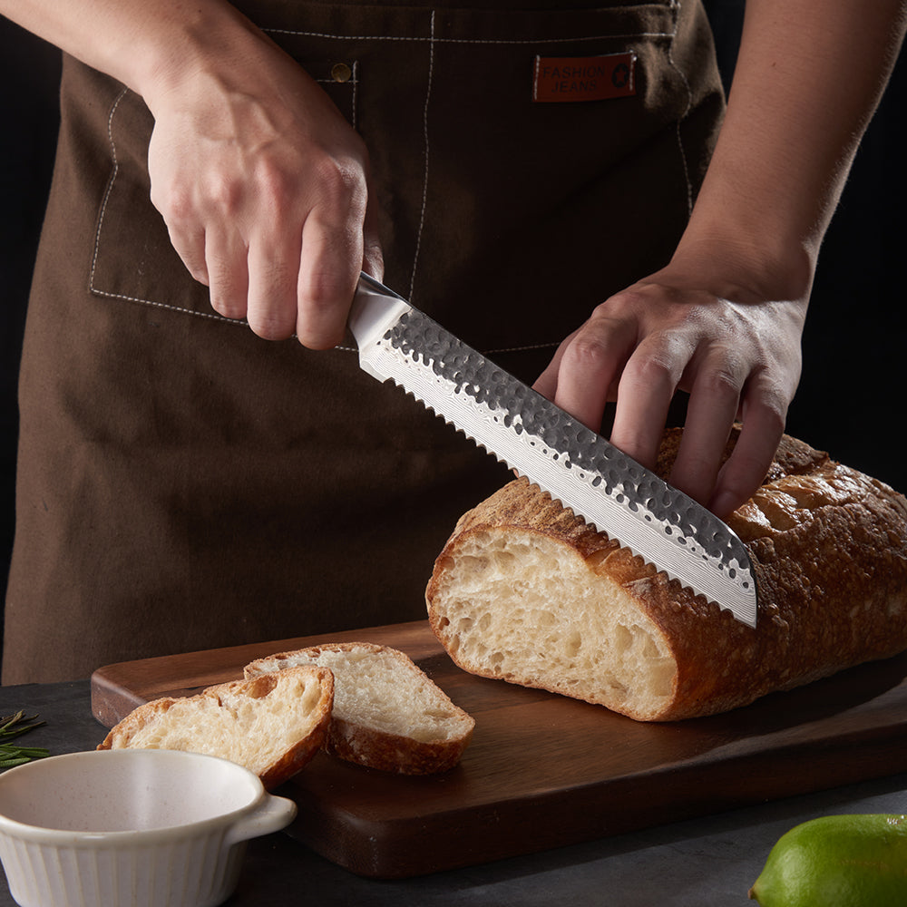 - Tăiere netedă fără a zdrobi miezul.Lama Damasc 67 straturi – Zimți durabili pentru tăieturi curate și fără efort