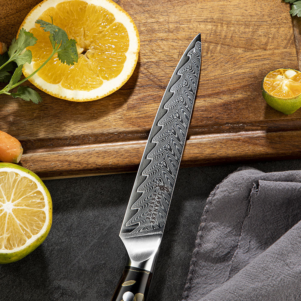- Flexibilitate pentru sarcini de tăiere diverse.Lama Damasc 67 straturi – Rezistență excelentă și finisaj decorativ
