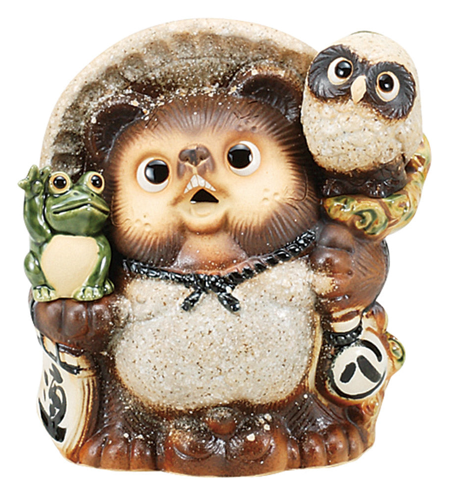 Figurina Ceramica Japoneza, Tanuki Shigaraki cu Bufnita si Broasca, 25 cm