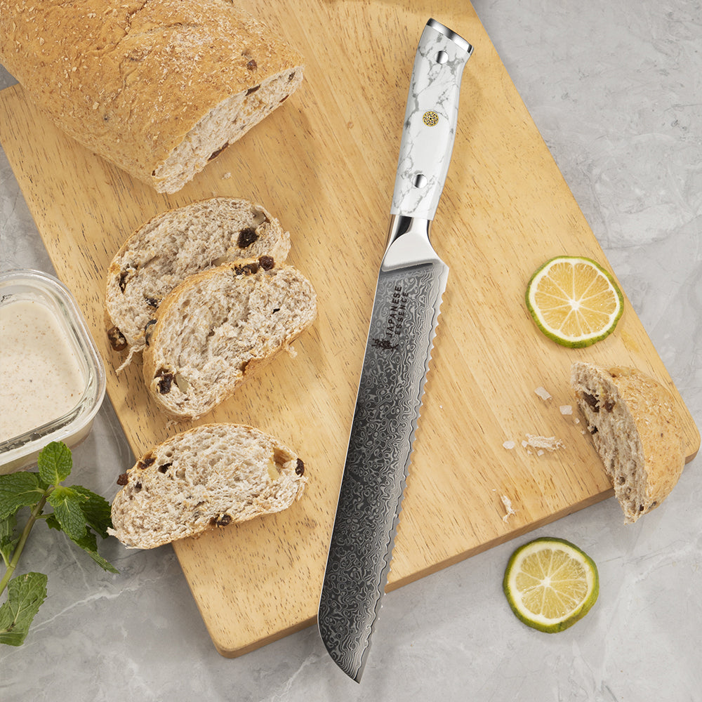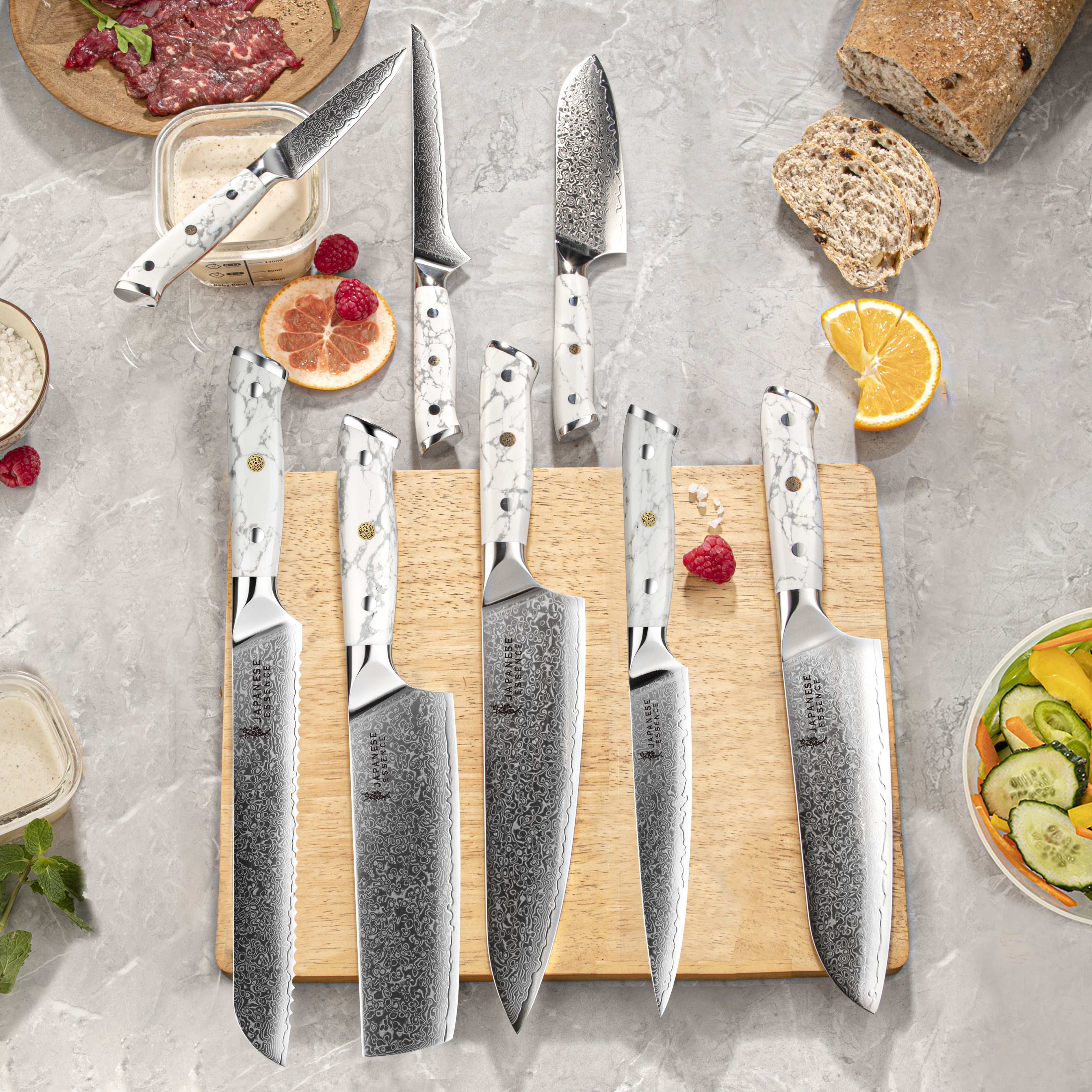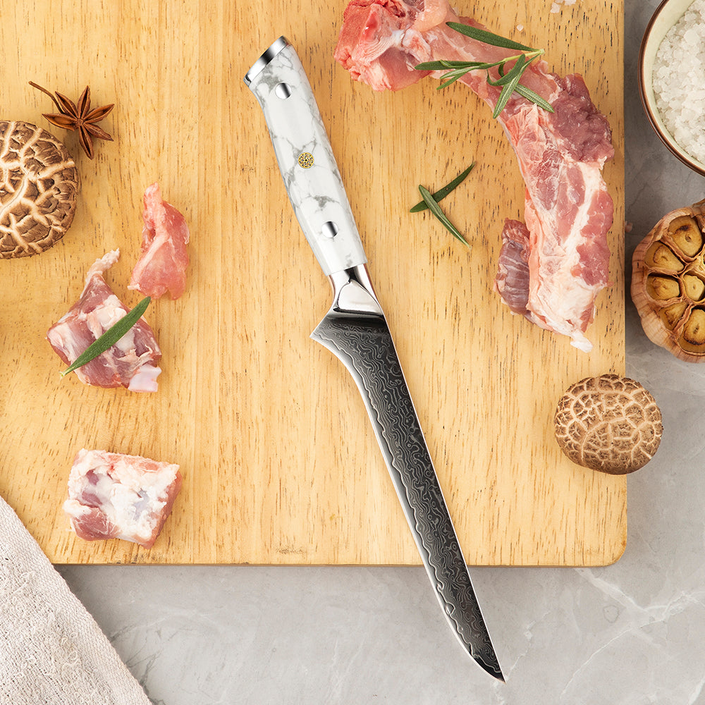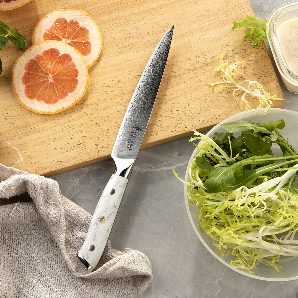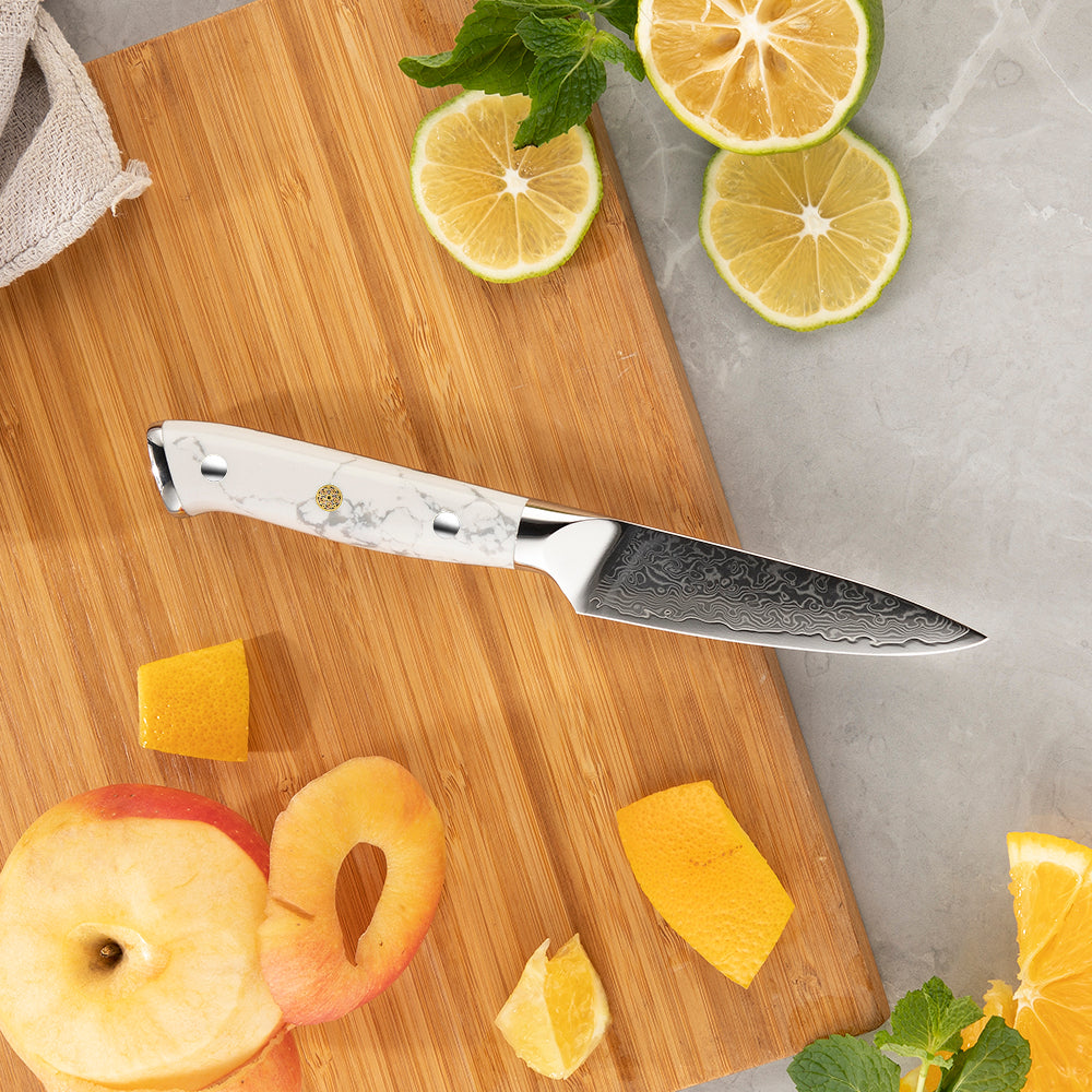 Mânerele din piatră turquoise albă adaugă un contrast spectaculos între naturalețea albului marmorat și luciul metalic al lamelor. Forma ergonomică oferă o prindere sigură, iar echilibrul perfect între greutate și control transformă fiecare cuțit într-un instrument de precizie.