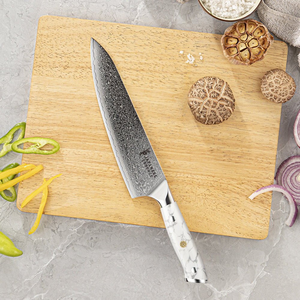 Un set premium de 8 cuțite japoneze Damascus, creat pentru perfecțiune în tăiere și eleganță absolută în prezentare. Fiecare lamă este realizată din oțel Damasc cu 67 de straturi și un nucleu 10Cr15CoMoV, oferind o duritate de 60±2 HRC și o ascuțime excepțională, ideală pentru utilizare profesională.