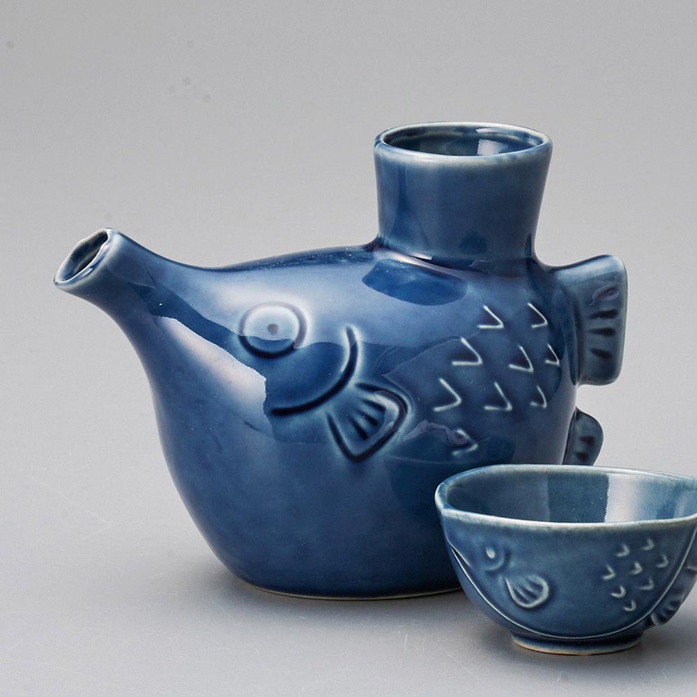 Set Japonez pentru Sake, Model Peste Fugu, Albastru