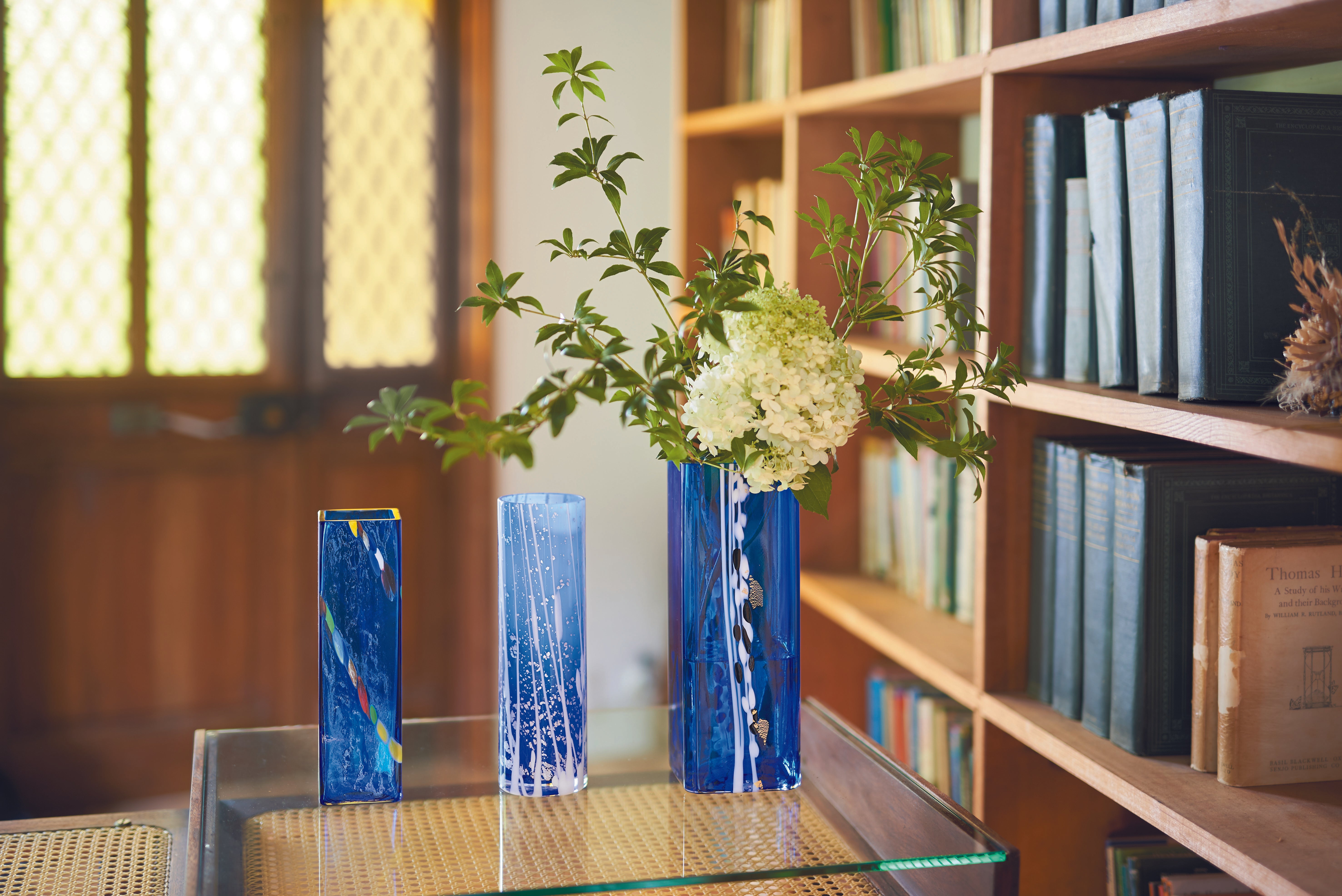 - Sticlă suflată manual Tsugaru Vidro – Textură și culoare unice, realizate prin tehnici tradiționale japoneze.